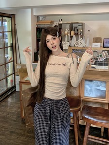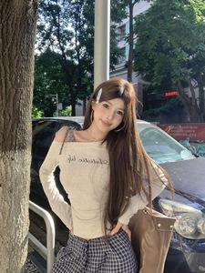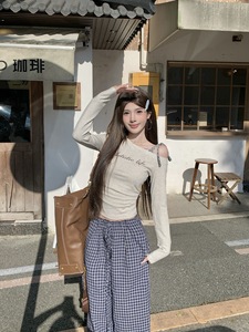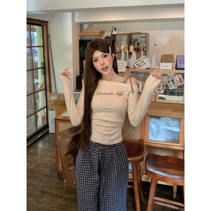 PPHOME甜辣风绑带斜肩长袖T恤女秋季小众字母印花修身上衣打底衫