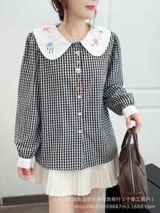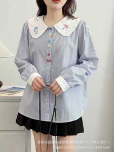日系刺绣棉衬衣娃娃领长袖彩扣宽松条纹衬衫