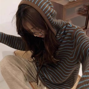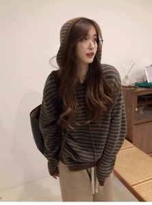 跨境秋冬新款条纹连帽毛衣女装小个子短款宽松外搭包芯纱针织衫女