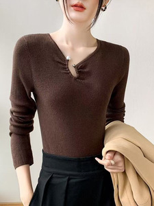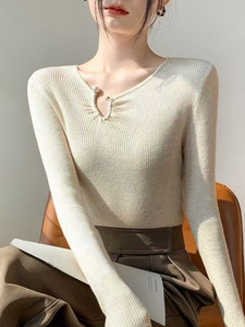 哥家商场同款女装2025秋季V领针织打底衫小众设计感修身显瘦上衣