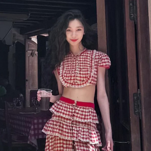 复古法式格子撞色减龄泡泡袖翻领上衣甜辣风蝴蝶结系带露脐短衬衫