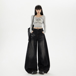 重工水洗弯刀牛仔裤女秋冬季新款复古高街慵懒风宽松高腰镰刀裤子