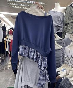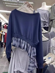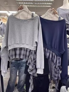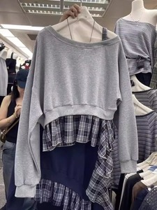 韩系2025早秋新款慵懒风斜领露肩格子拼接假两件设计感洋气卫衣女