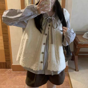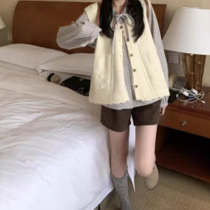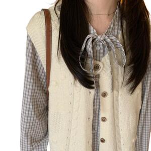 黑白格飘带叠穿衬衫+百搭针织马甲无袖上衣秋季新款