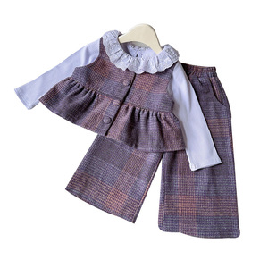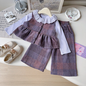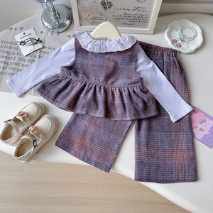 春秋女童套装新款2025打底衫背心上衣格子阔腿裤小女孩休闲三件套