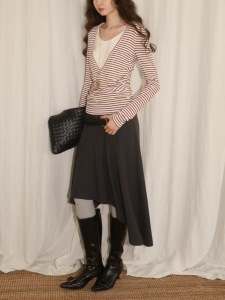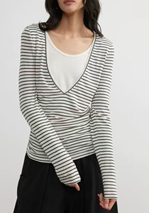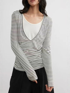 素舶莱赛尔羊毛柔软亲肤条纹撞色收腰假两件长袖上衣