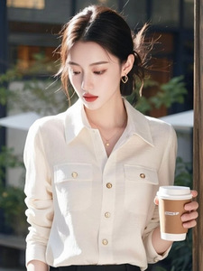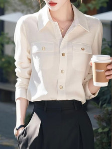 2025年春秋新款韩版时尚双口袋白色显瘦衬衫女士Polo领上衣女
