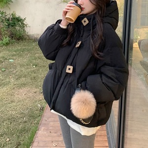 连帽牛角扣羽绒服女秋冬新款宽松华夫格短棉服加厚小个子棉衣外套