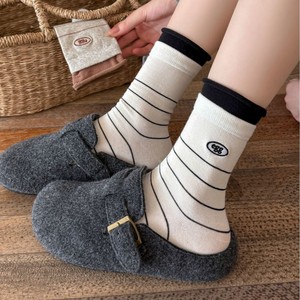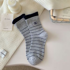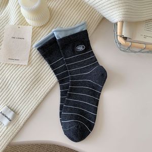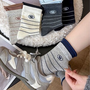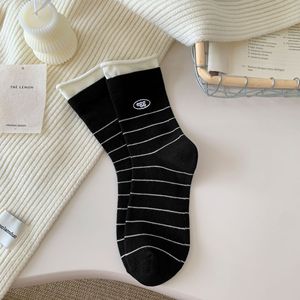 韩版egg刺绣袜子春秋季条纹简约撞色中筒袜学生运动双罗口堆堆袜