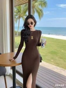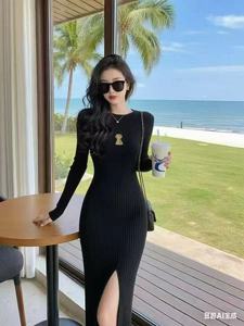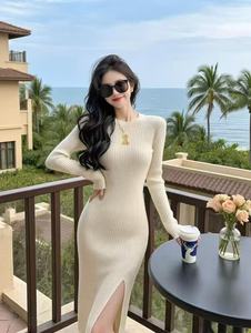 25秋冬季热销圆领金属镂空装饰胸口挖空露胸针织长袖背心连衣裙女