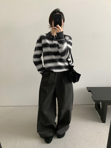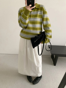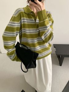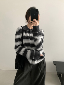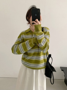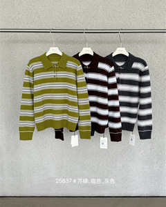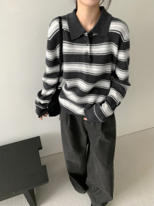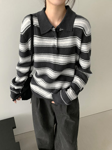 TG 怀旧复古条纹套头针织POLO衫女2025秋季新款宽松通勤毛衣25837