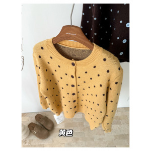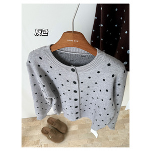 撞色波点提花针织开衫女秋季慵懒甜美风简约百搭上衣薄