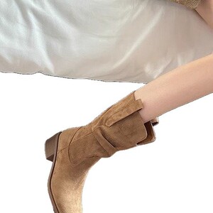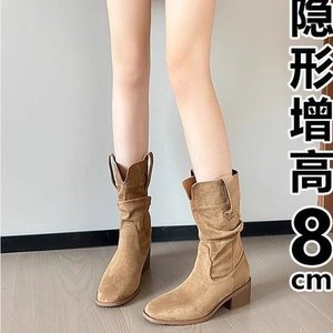 内增高绒面西部堆堆靴女2025新款秋冬复古风小个子粗跟中筒马丁靴