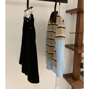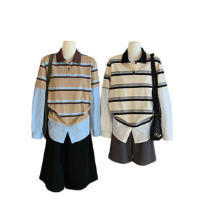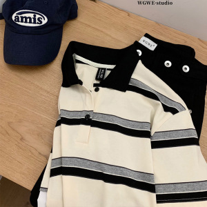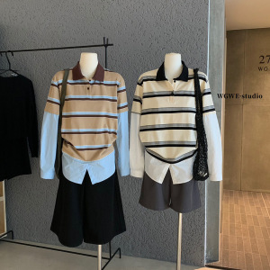 WGWE7204设计感小众假两件拼接撞色条纹学院风翻领长袖上衣