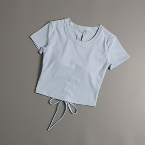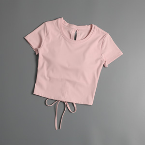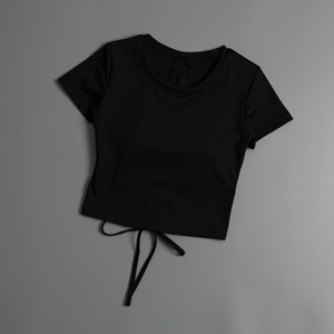 2025法式夏季甜辣妹圆领抽皱多巴胺纯色上衣女款百搭镂空抽绳T恤