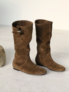 牛皮版~显瘦内增高靴子绒面骑士靴女圆头不过膝长筒靴褶皱西部靴