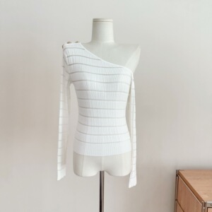 茶艺小巴茶系显胸打底 纯欲纱纱拼接针织斜肩上衣打底