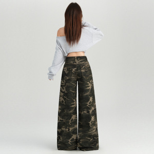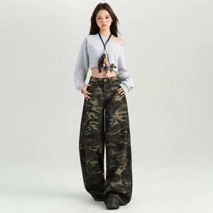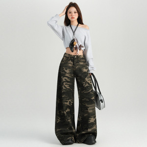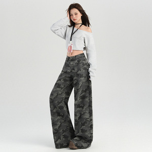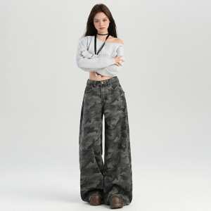 25秋冬新款 迷彩单品百搭高腰阔腿直筒休闲裤女灰色迷彩长裤图案