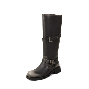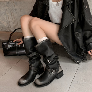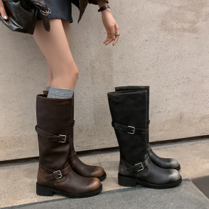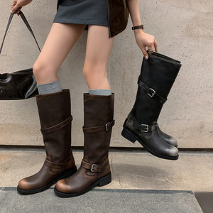 皮带扣做旧擦色骑士靴女高筒长靴子牛皮新品圆头粗跟套筒女及膝靴