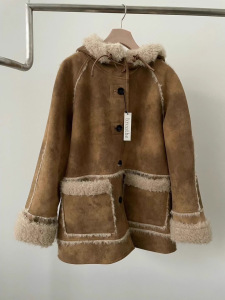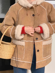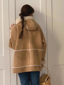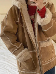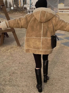 现h韩国东大门同款秋冬breathe皮毛一体中长款连帽羊羔毛毛外套