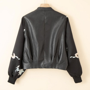 中老年女装拼接皮衣外套女新款黑色复古国风立领提花盘扣皮夹克女