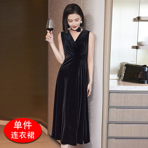 时尚蓝色休闲法式无袖连衣长裙子秋季女小个子高级感收腰女装6150