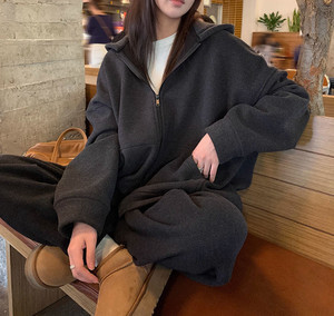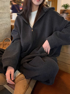 韩版复古磨毛拉绒 廓形双拉链卫衣女秋冬加绒加厚宽松连帽外套