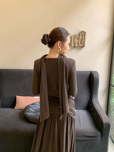 万为 法式飘带上衣女2025秋季新款不规则层次感披肩式打底衫Y6033