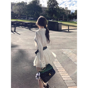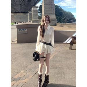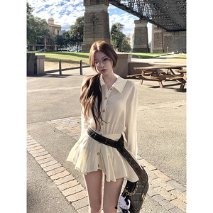 法式复古风长袖衬衫连衣裙女早秋胖MM设计感收腰a字短裙