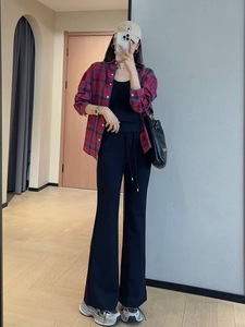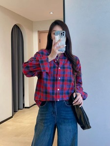 WTHEONE高颜值多巴胺复古红蓝格纹显瘦翻领长袖衬衫外套女2025秋