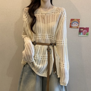 波西米亚镂空针织罩衫毛衣女秋装大码胖mm显瘦中长款系带收腰上衣