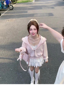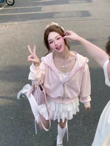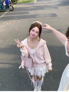 纯欲甜美风木耳边卫衣拉链开衫外套女秋季设计感打揽短款宽松上衣