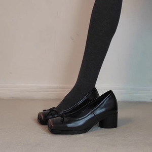 羊皮版~方头猪鼻子复古蝴蝶结芭蕾舞鞋女浅口气质粗跟玛丽珍单鞋