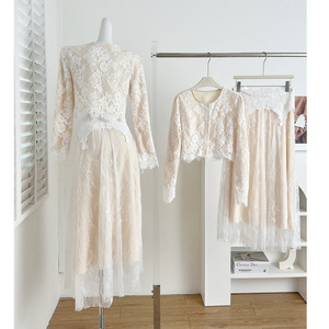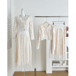 2025早秋新款韩系穿搭修身短款蕾丝长袖上衣设计感高腰显瘦半身裙