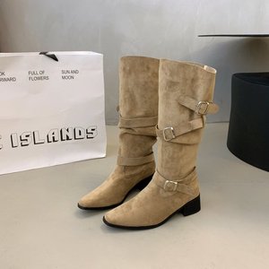 牛皮版~粗跟真皮复古长筒靴女皮带扣褶皱堆堆靴高筒西部牛仔靴子