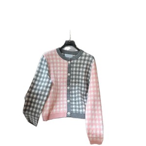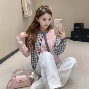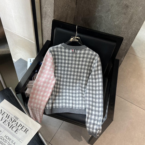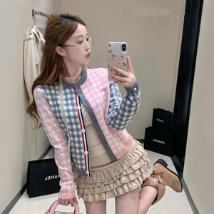 秋季TB新款羊毛混纺开衫法式复古撞色圆领单排扣短款羊毛针织开衫