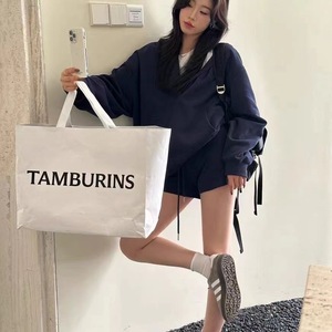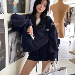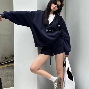 休闲套装女春秋美式复古宽松V领慵懒风连帽长袖卫衣短裤两件套潮