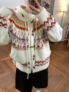 慵懒宽松连帽毛衣外套女秋冬外穿中长款高级感百搭学院风针织开衫