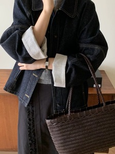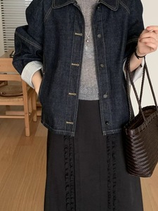 牛仔翻领单排扣外套2025年秋季条纹卷边拼接宽松廓形