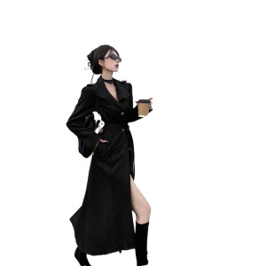 韩系时尚立领系带黑色皮衣风衣外套女秋冬大衣气质高级感长款外套