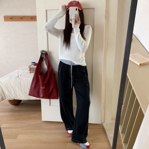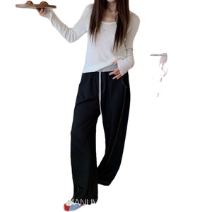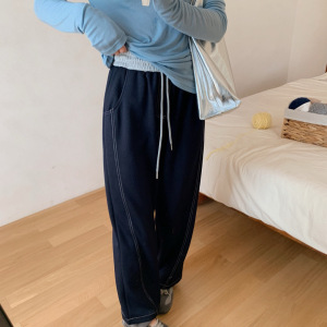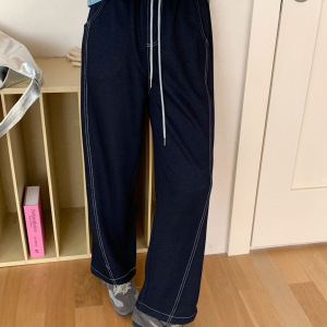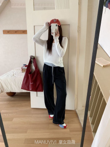 MANUVIVI摩女薇薇天丝手感免水洗拼接牛仔裤弯刀高腰显瘦阔裤女生