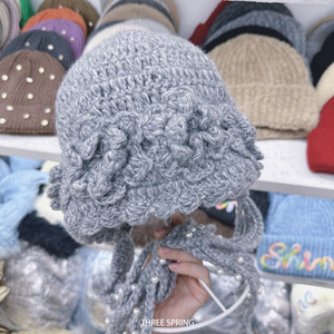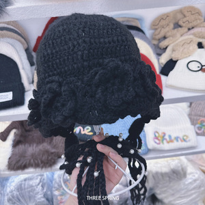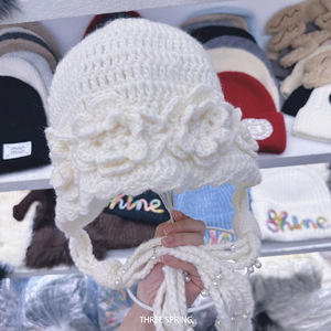 批发韩国2025年新款复古钩花流苏珍珠毛线帽女绑带护耳保暖雷锋帽