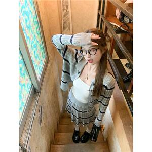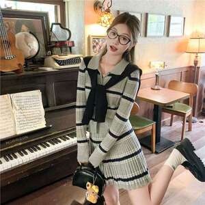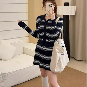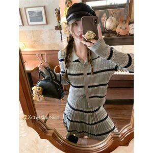 曾小咸 韩系灰色polo领条纹针织衫女秋冬季穿搭长袖上衣裙子套装
