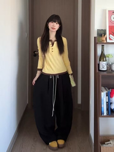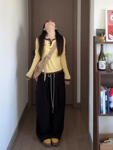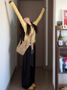 韩系休闲设计感黄色假两件长袖T恤女秋季气质修身显瘦打底衫上衣