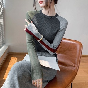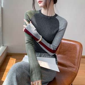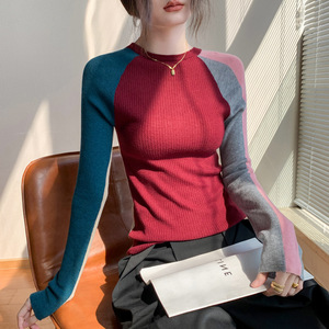 撞色拼接毛衣女秋冬修身复古设计感套头插肩内搭针织打底衫