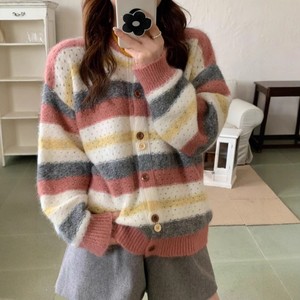 韩版2025秋冬新款圆领宽松百搭显瘦毛衣潮软糯条纹纽扣针织开衫女
