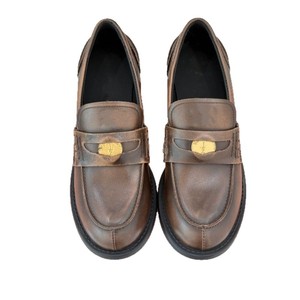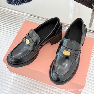 牛皮版金币厚底小皮鞋女春粗跟高跟鞋一脚蹬乐福鞋小个子单鞋
