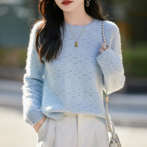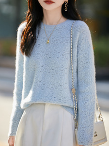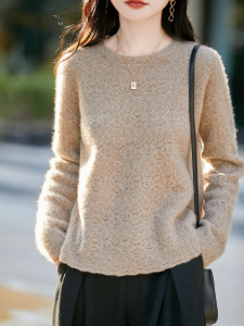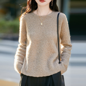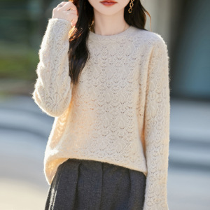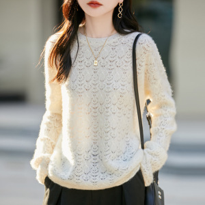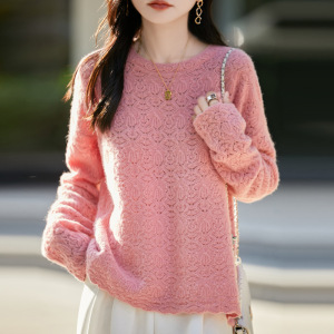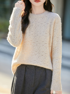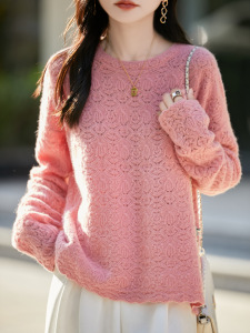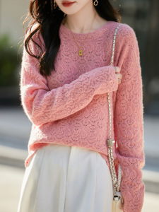 法式钩花镂空100羊毛衫女圆领保暖打底毛衣2025新时髦洋气上衣