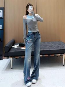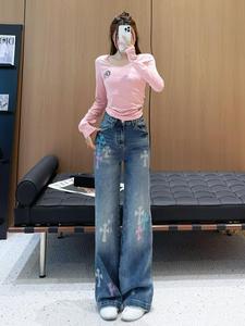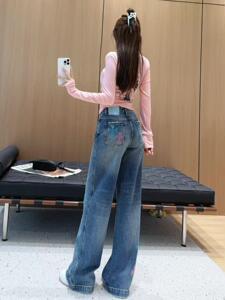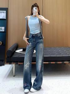 蓝色做旧复古牛仔裤烫钻刺绣设计感阔腿裤高腰显腿长南油女直筒裤