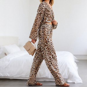 欧美秋冬新款休闲豹纹绑带睡衣长袖长裤两件套女士家居服2025跨境